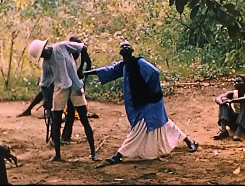 Le ciné-transe, l’invention de Rouch. Une façon particulière de filmer, en étroite communion avec ces africains possédés par les esprits. Et lorsque les esprits tardent à se manifester, l’intervention de la caméra (Rouch filmant) peut très bien déclencher la transe, comme dans le plan-séquence du film de 1971 Tourou et Bitti, les tambours d’avant.