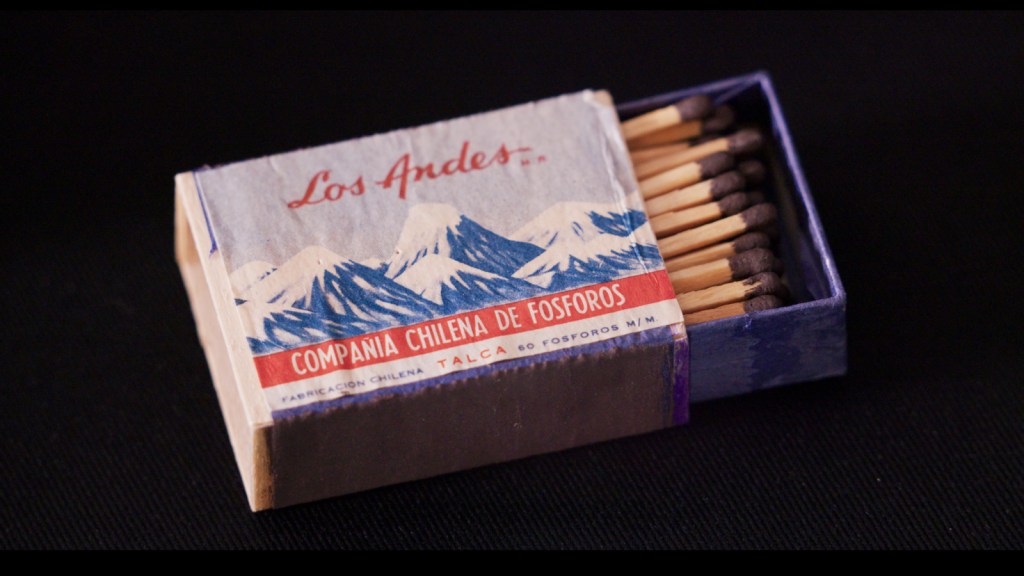 Nous survolons donc la Cordillère des Andes, les sommets enneigés se détachant sur un ciel d’un bleu pur, avec parfois quelques trainées nuageuses seulement. Une vision aussi de la chaine montagneuse vue dans la profondeur de champ avec en premier plan la ville, la capitale en vue aérienne également. Et dans la quotidienneté des habitants de Santiago, cette immense photo –ou fresque peinte – sur le mur d’une station de métro. La montagne est omniprésente donc dans le film de Patricio Guzman, mais au fond elle lui reste inconnu, impénétrable, inaccessible. Et dans son souvenir d’exilé elle est réduite à des images bien fades sur les boites d’allumettes.