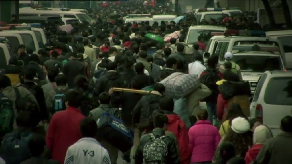 D’abord il faut pouvoir se procurer des billets, c’est-à-dire attendre devant des guichets qui immanquablement finissent par annoncer qu’il n’y a plus de billes à vendre. Puis il faut attendre dans la gare, avec les autres, parmi les autres. D’où dans le film ces vues en plongées sur cette foule filmée par un interminable panoramique qui semble ne jamais pouvoir atteindre sa limite. Et quand le train est à quai, alors là il faut se précipiter, jouer des coudes (l’expression est quand même bien faible), se hisser dans le wagon, trouver une place, essayer de caser ses bagages – de gros sacs encombrants – et attendre le départ. Le voyage est souvent long. Tout le monde fini par s’endormir. Du moins, ceux qui ont une place assise.