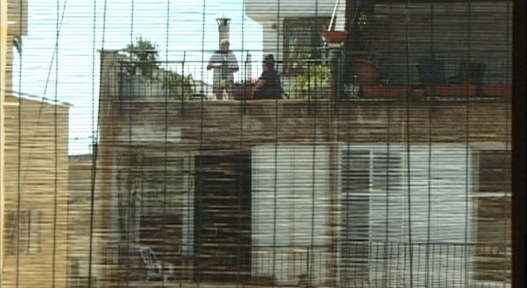 Il a pourtant des variations dans ce surcadrage de l’extérieur vu depuis l’appartement. D’abord ce n’est pas toujours le même immeuble qui nous est donné à voir. Mais nous finissons par reconnaitre quelques-uns de leurs habitants sur leur terrasse, l’homme qui s’occupe de ses plantes, le couple qui boit du café. Les immeubles sont cadrés de façon plus ou moins serrée ; parfois des plongées nous font découvrir la rue, en bas, avec ses voitures en stationnement et ses quelques passants. La lumière change aussi en fonction des moments de la journée, à la tombée du jour où au petit matin. Il y a quelques plans de nuit. En dehors des appels téléphoniques et du récit en voix off, la bande son capte les bruits quotidiens, des pas dans la pièce ou des bruits de vaisselle, des véhicule dans la ville, quelques chants d’oiseau. En dehors des plongées sur la rue, l’extérieur c’est la mer, filmée elle aussi en plans fixes, depuis la plage. Quelques promeneurs traversent le champ. Quelques enfants jouent. Mais ces plans restent l’exception. La fin du film montrera l’intérieur de l’appartement. Un plan plus large, toujours en direction de la fenêtre qui laisse entrevoir l’immeuble d’en face mais qui permet de découvrir plus précisément le lieu où le film s’est déroulé. Sur la fenêtre de droite, le store est fermé et nous pouvons apercevoir le reflet de la cinéaste qui se brosse les dents. « Je suis à tel Aviv » seront ses derniers mots. Le téléphone sonne encore une fois, mais la conversation est inaudible, couverte par les bruits de la ville.