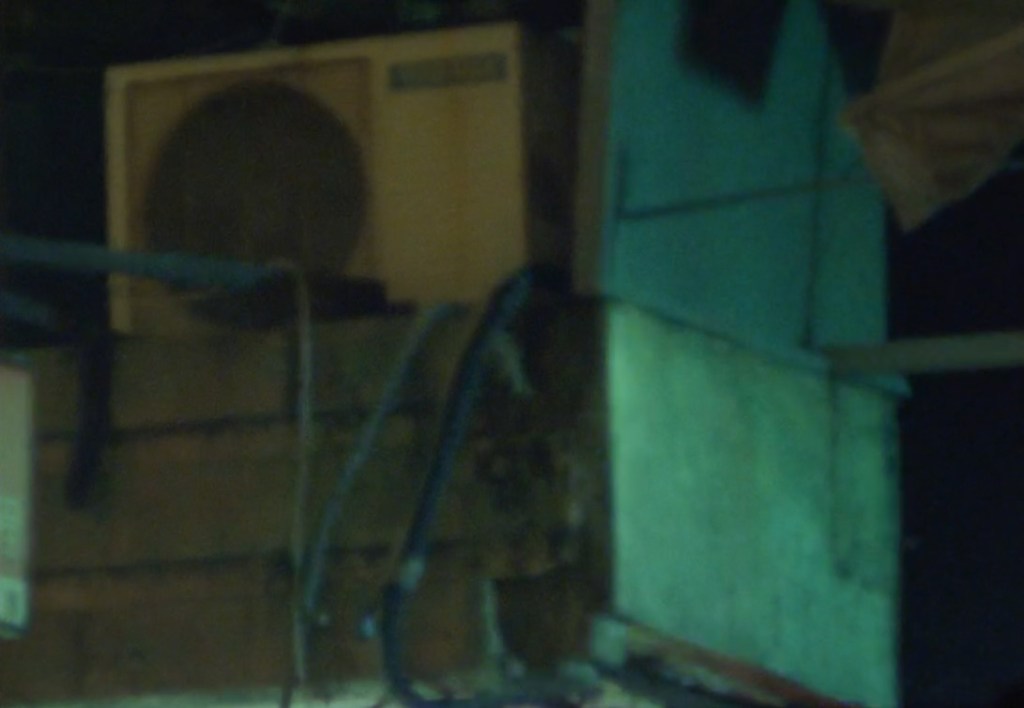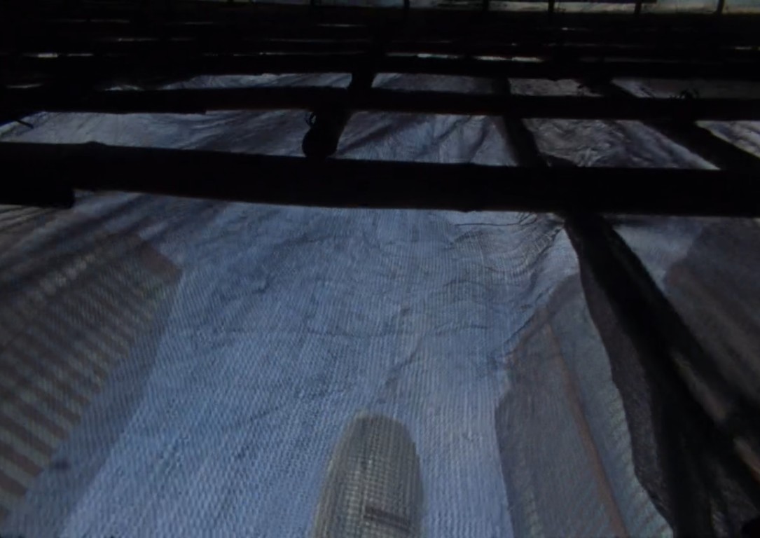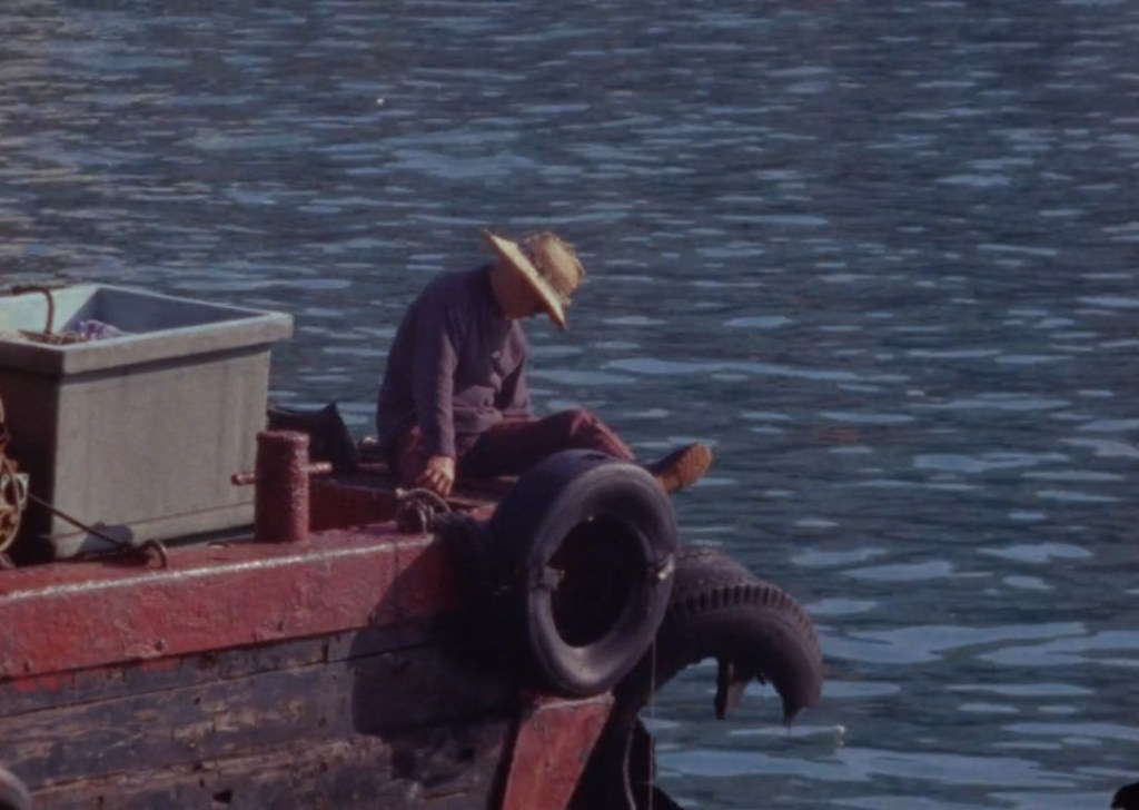 Des immeubles bien sûr. Beaucoup d’eau aussi, qui ruisselle. Des néons. Des ouvriers au travail dans des gerbes d’étincelles. Des fenêtres qui ondulent. Les manèges d’une fête foraine qui donnent le tournis. Mais quand même un plan calme, mais bref, d’un pécheur sur son bateau. Les escalators montent et descendent. Il n’y a jamais d’arrêt. De répit.