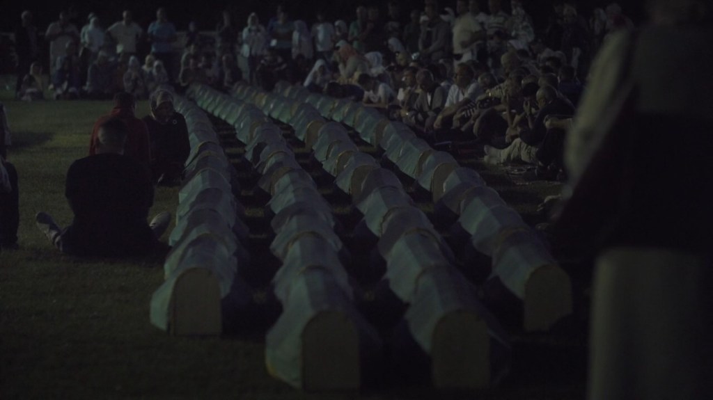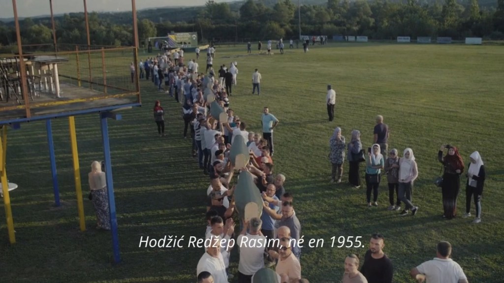 Pourtant, lorsqu’aucune cérémonie funèbre, aucun hommage posthume, n’a pu avoir lieu, il n(est pas possible pour les familles de faire le deuil de leurs disparus. C’est pourquoi le film se devait de prendre part à ce travail. Il le fait en montrant le travail minutieux de reconstitution des squelettes. Et surtout en filmant avec une grande pudeur l’immense cérémonie collective où les cercueils des disparus identifiés, passant de bras en bras, vont trouver une place dans le cimetière attenant à la mosquée de la ville.