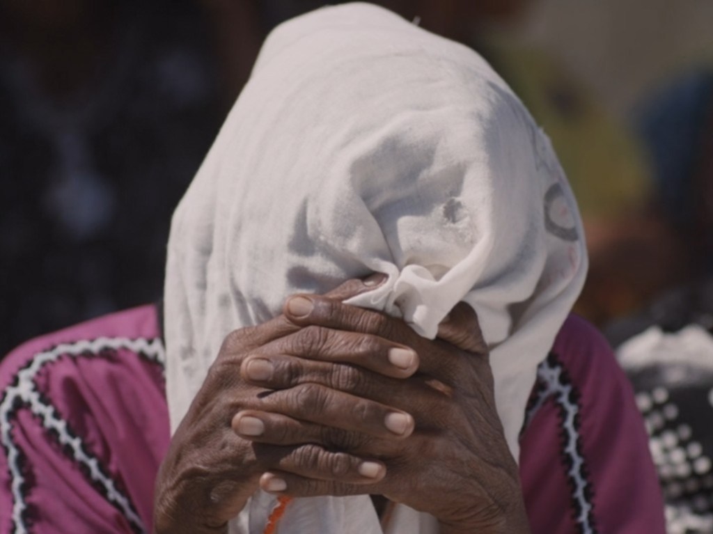 Le tombeau, puis le cercueil ont été ouverts. Un long plan fixe va suivre le travail de Doris, au milieu des membres de la communauté, qui l’entourent, silencieux. Une présence qui est une participation. Sous le guidage de sa grand-mère, elle arrache le crane du reste du corps, ramasse aussi et essuie les os des membres, et dépose le tout dans un grand sac blanc. Un plan interminable, entièrement statique en dehors du mouvement des mains de Doris qui agissent dans le cercueil. La caméra étant placé au niveau de ce dernier, Doris et surtout les hommes derrière elle sont vus en contre-plongée. Une caméra qui observe, imperturbable, ces observateurs immobiles du déroulement du rite.