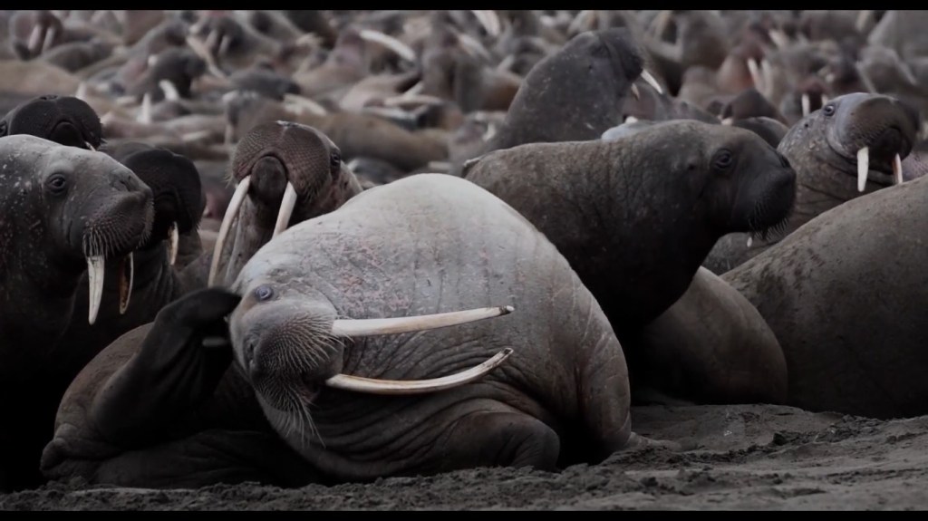 Les images renvoient à la vie actuelle, aux activités quotidiennes, la pèche en particulier. Des paysages dans des vues très esthétiques, mais surtout beaucoup d’animaux dans leur milieu naturel, des morses, des ours, des troupeaux de rennes. Même lorsqu’un renne est égorgé, on sent que c’est avec un profond respect de l’animal.