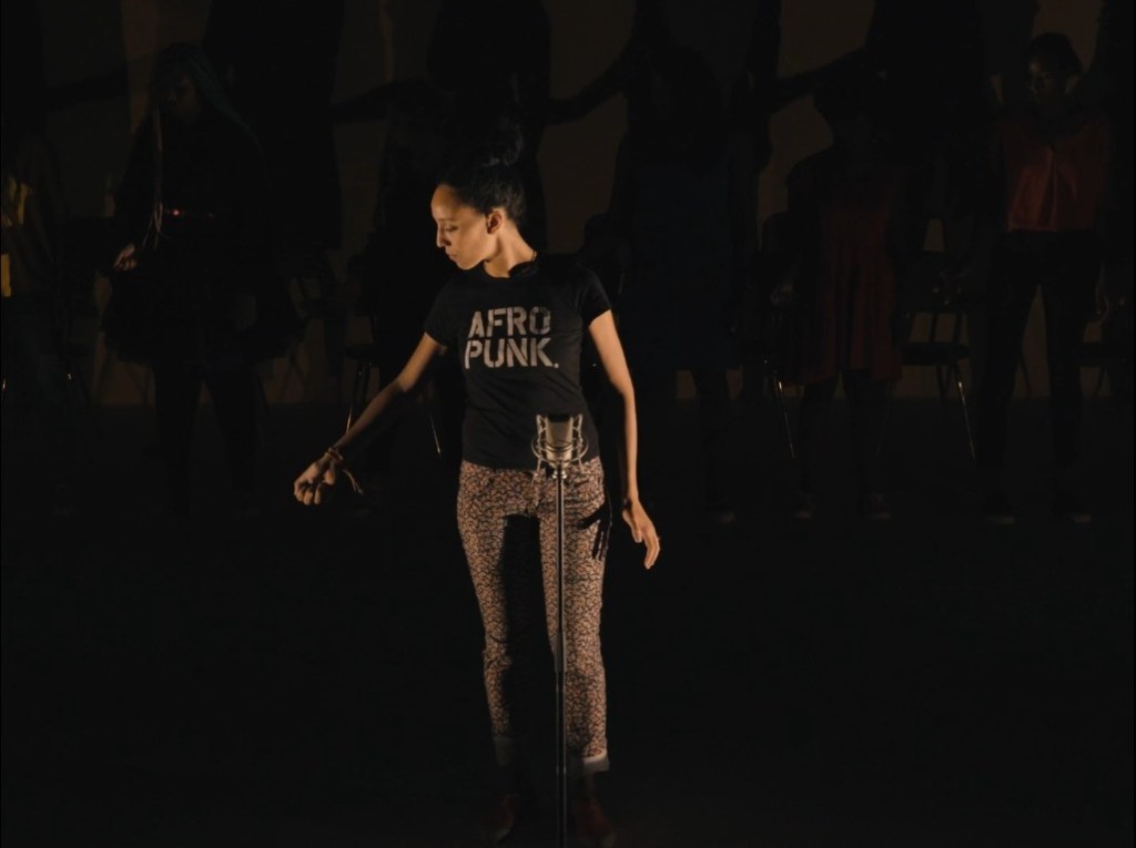 Les voix du titre, ce ne sont sûrement pas celles que l’héroïne du film entendrait dans sa tête, mais plutôt celles qui résonnent dans le théâtre où elle prépare et réalise une performance, et aussi celle des bavardages intimes avec sa grand-mère.