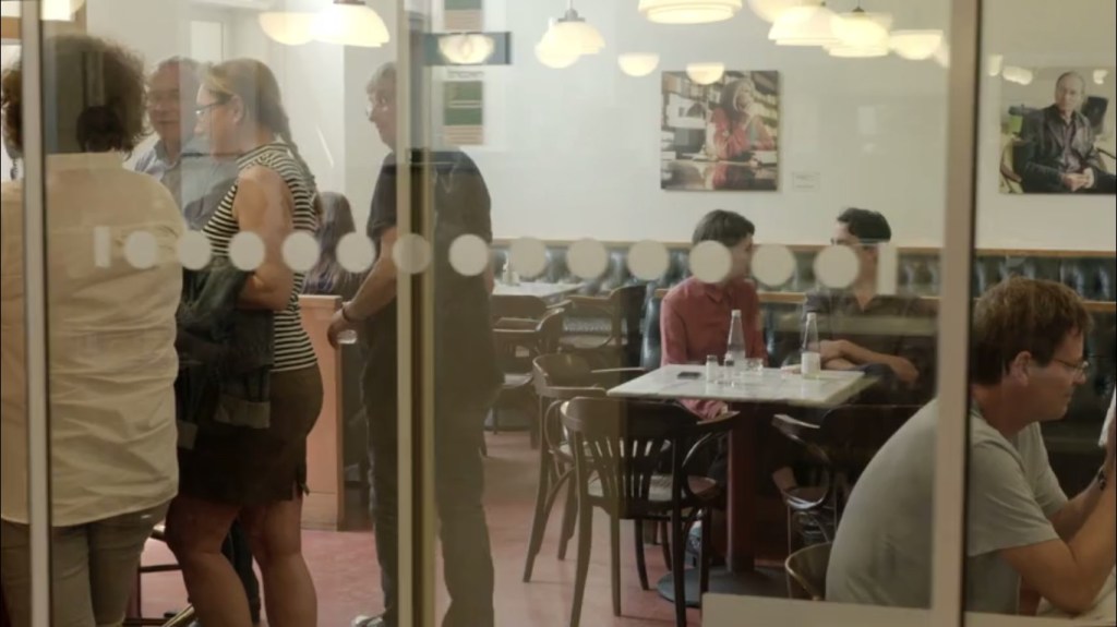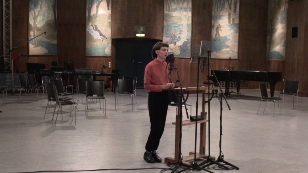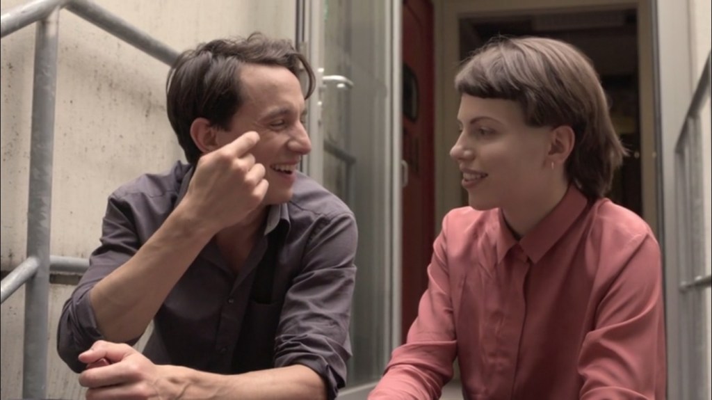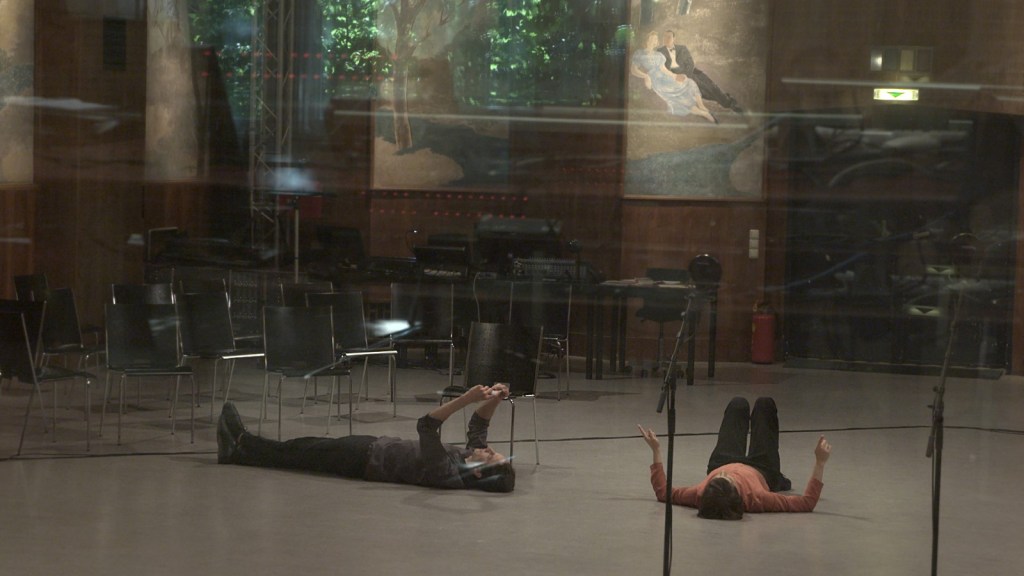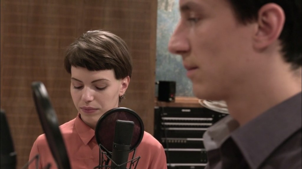 Rarement nous quittons cette situation d’enregistrement. Une seule fois un homme – technicien, ingénieur du son, producteur ? – intervient pour régler les micros. Dans un autre plan, il y a quelques personnes présentes dans la cafétéria où les deux acteurs se rendent. Mais pour tout le reste – pour pratiquement tout le film donc – nous ne sortons pas de leur face à face dans le studio. Un studio que nous ne quittons que pour de brefs moments de pose, où – souvent assis côte à côte – ils fument une cigarette, se détendent. Rarement ils commentent la relation de Paul et Ingeborg, leurs sentiments. Ces sentiments, les ressentent-ils l’un pour l’autre ? Ils ne le disent pas. Mais leur proximité tout au long du film, et la façon dont ils sont filmés, ne peut que nous le suggérer.