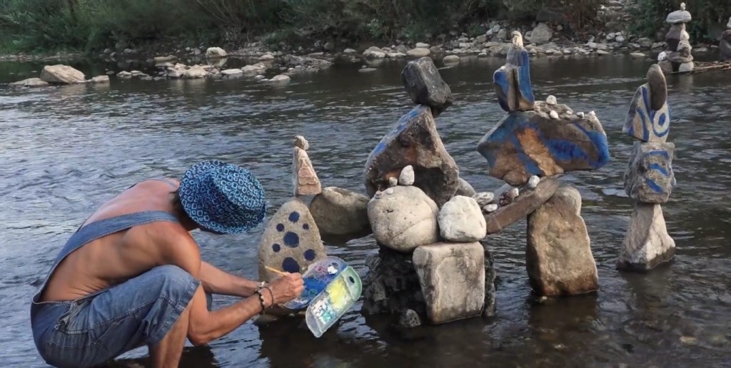 D’abord la cinéaste prend comme personnage central un homme particulièrement attachant, Alec. Dans les premiers plans du film on l’écoute chanter devant le supermarché du coin en s’accompagnant à la guitare. Un artiste ! Dont les chansons (on en découvrira d’autres dans la suite du film) sont originales. Un artiste doublé d’un ingénieur qui s’ignore, un créateur capable de construire des mécanismes étonnants avec une roue de bicyclette et quelques tuyaux. C’est qu’il s’est mis dans la tête de construire une fontaine. Il dessine les plans. Fait des essais. Ne réussit pas du premier coup. Mais persévère jusqu’à ce qu’il puisse installer son « œuvre » près de la rivière. Une rivière où d’ailleurs ses amis, les membres de sa « tribu » comme il dit, font eux aussi œuvre artistique en accumulant des rochers, en érigeant des statues ou des sculptures avec et en les peignant de couleurs vives. On n’est pas loin de Tinguely et de Niki de Saint Phalle.