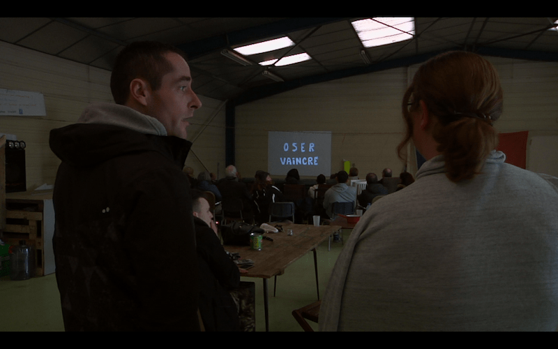 L’aventure du film se déroule dans la Maison citoyenne, principal lieu du tournage. Nous sommes en périphérie de Rennes, sur la commune de Saint-Grégoire, dans une zone industrielle proche de l’immense centre commercial « Grand Quartier ». Le bâtiment n’a rien d’attrayant, c’est une longue bâtisse de tôle, au toit plat, avec une baie vitrée sur le devant, qui devait accueillir un magasin de pièces automobiles ou un garage. Un lieu qui va reprendre vie grâce aux Gilets Jaunes ! Pour le groupe, c’est d’abord un refuge. Un abri en dur après les premières semaines passées entre cabanons et palettes sur les ronds-points. Le bâtiment a été rendu opérationnel en quelques jours : on l’a nettoyé, on a rebranché l’eau, l’électricité, réparé ce qui devait l’être. On l’a meublé avec ce que chacun a pu rapporter de chez soi ou ce que des sympathisants du mouvement sont venus donner. Il y a des chambres, une cuisine. La grande salle peut accueillir trois cents personnes debout, de quoi voir venir. Le groupe se prépare à vivre là, à y organiser la lutte. À y passer le temps qu’il faudra.