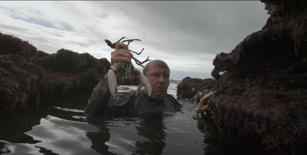 Si nous voyons beaucoup les falaises dans le film, c’est que nous suivons notre pêcheur, sur la plage, sur les rochers, dans l’eau à marée basse. Nous le voyons pêcher, patiemment, filmé au plus près. Une technique impeccable : il plonge la main sous l’eau après avoir repéré un trou et au toucher, il sait s’il y a une étrille, un tourteau ou un homard, qu’il suffit alors de sortir de sa cachette sans se faire pincer. Une pêche assez dangereuse en somme. Dont la simplicité n’est qu’apparente. Sans compter les risques de chute sur les rochers glissants.