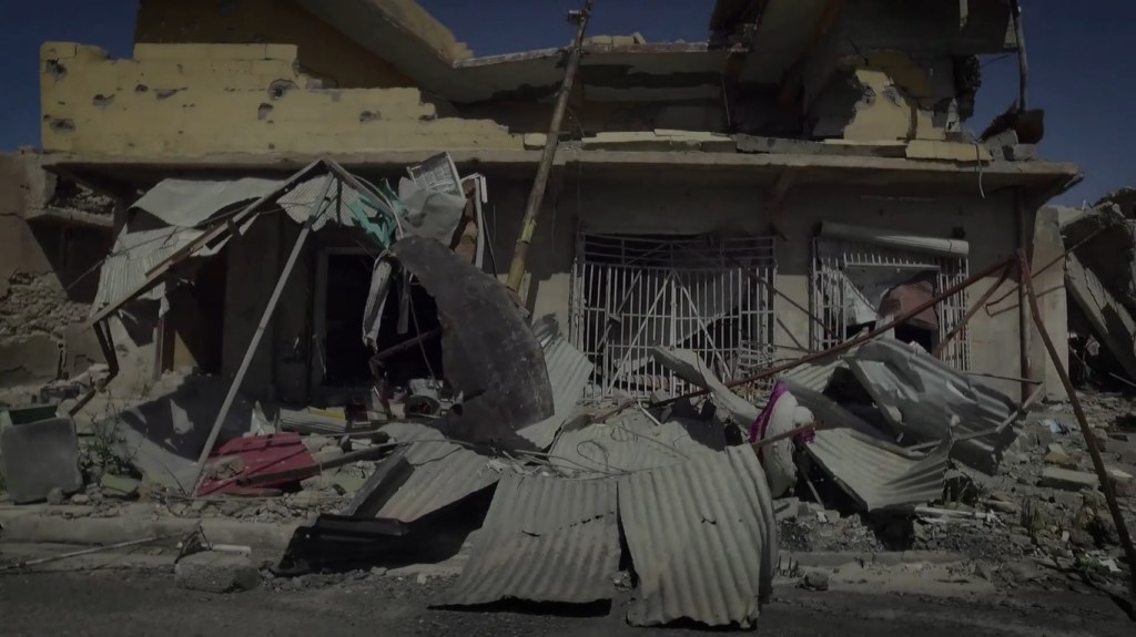 Une guerre dont nous voyons les effets. Une deuxième longue pérégrination, dans les rues de la ville détruite cette fois. Une longue suite de ruines, de rues dévastées, de maisons et d’immeubles réduits à des tas de gravats. Sinjar pourra-t-elle renaître de ses cendres ? Des images qui sont un appel à ne pas oublier. Un cri pour éveiller les consciences.