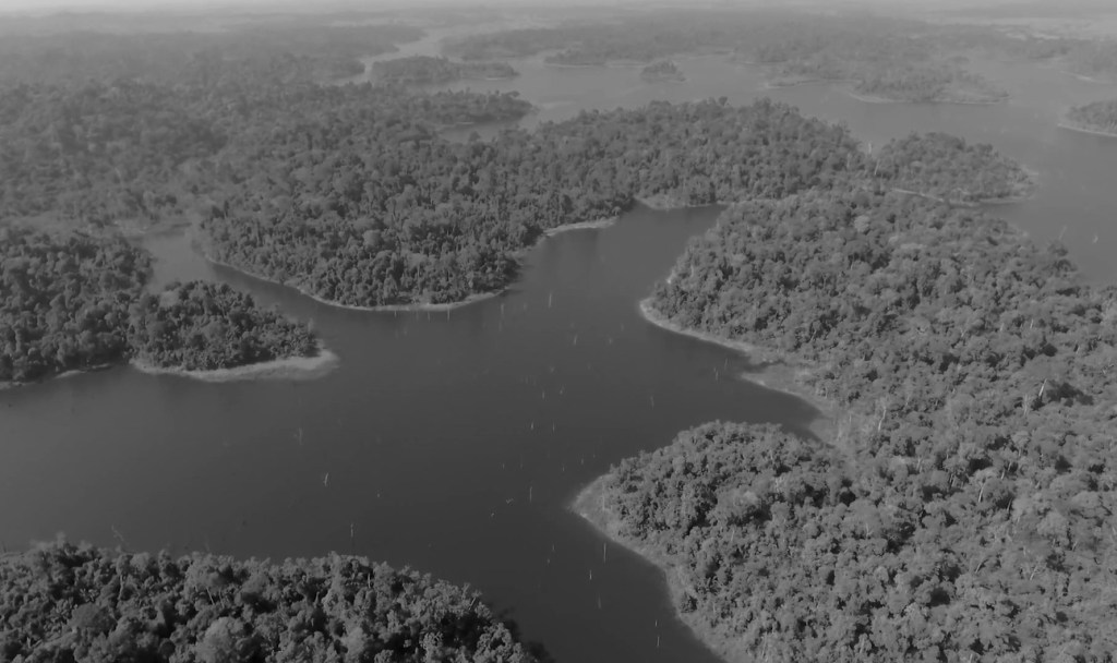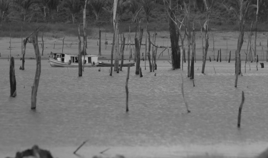 De vastes étendues d’eau. Filmée au raz de la surface ou bien en plongée vue du ciel pour dominer l’immensité de l’espace. Et des arbres. Ou ce qu’il en reste. Des souches ; inondées. Ou des troncs morts qui émergent de l’eau. Des noyers du Brésil. Une espèce en voie de disparition. Est-il possible d’en filmer un intact ?