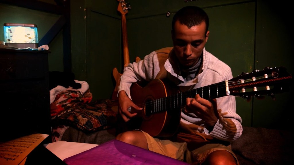 La dimension locale, le film l’aborde à travers la rencontre avec un jeune marocain dont nous suivons tout au long du film les étapes de la vie, ses activités et ses pensées. Il travaille au port de la ville, du moins s’il y a des arrivages de poissons, ce qui n’est pas quotidien. Sa passion, c’est la guitare, la guitare classique, même s’il sait parfaitement s’accompagner lorsqu’il chante dans un style plus contemporain. Nous le voyons interpréter la sonate au clair de lune de Beethoven, seul devant son ordinateur qui lui sert de guide. Dans ses entretiens avec le réalisateur, ses propos sont de très pertinents contre-points à ceux tenus par les vacanciers venus d’Europe.