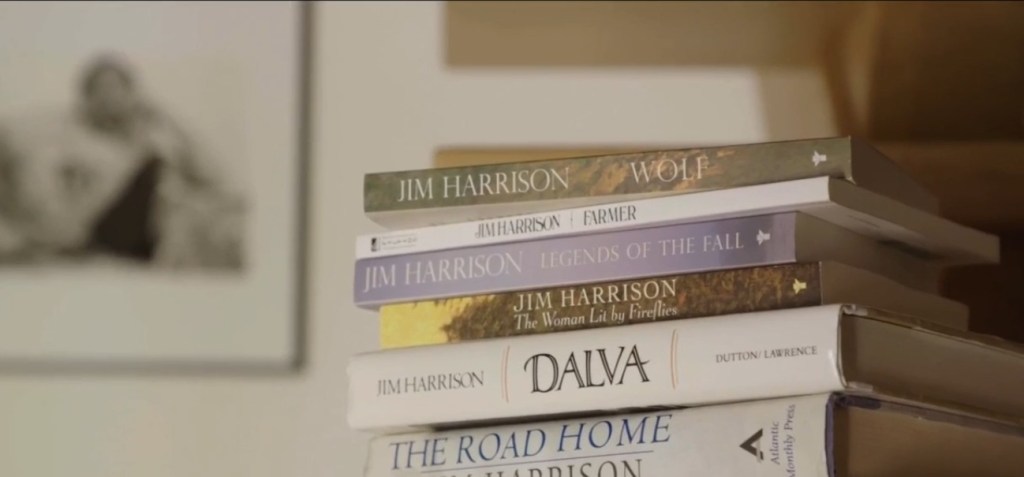 Il y a aussi des plans sur des piles de livres, dont nous pouvons voir le titre et l’auteur sur la tranche. Ses livres à lui. Mais aussi des livres qu’il lit, qu’il a du lire. Des livres qui font partie de sa bibliothèque. Et peut-être de ses références littéraires.
