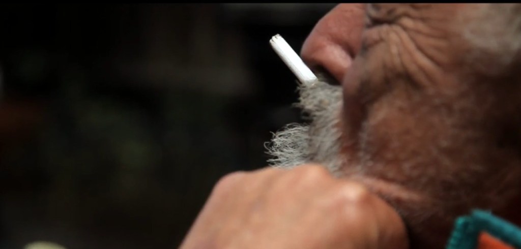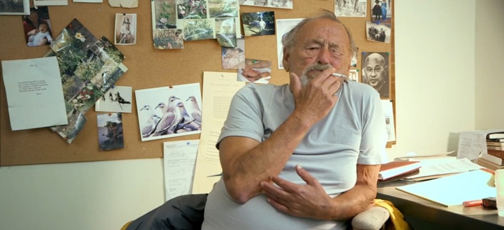 Seul face à la caméra, cadré en gros plan, il parle. Il nous parle, de lui, de sa vie, de la littérature. Un récit improvisé. Sans ordre apparent. Le fil n’indique ni partie, ni chapitre. Les cinéastes n’interviennent pas. Il ne parle pas beaucoup de son œuvre en fait. Il ne cite pas ses livres. Il préfère évoquer, comme en passant, son rapport à l’écriture, et à la littérature.