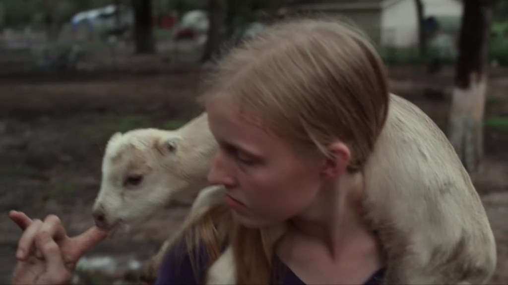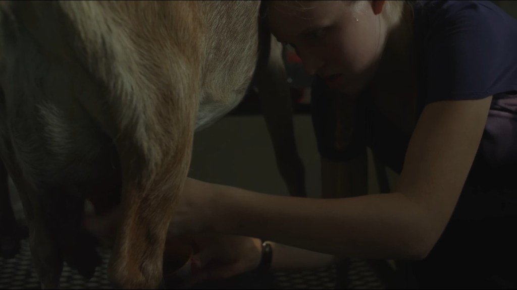 La famille : un couple et une multitude d’enfants (il est difficile de les compter !) Ils élèvent des chèvres et le début du film détaille ce travail, nourrir les bêtes, les traire, faire le fromage et aller les vendre au marché. Mais ce qui compte avant tout pour eux, c’est la religion, l’affirmation de leur foi qu’ils manifestent du matin – dès la prière du petit déjeuné qui ouvre le film – jusqu’au soir. Les enfants ne vont pas l’école, pour éviter les mauvaises influences et les ainés apprennent à lire aux plus petits. La mère se charge de l’éducation morale et religieuse. Dans une longue séquence elle explique à sa fille ainée que Dieu a créé la femme pour servir l’homme. Et cela doit guider la vie entière.
