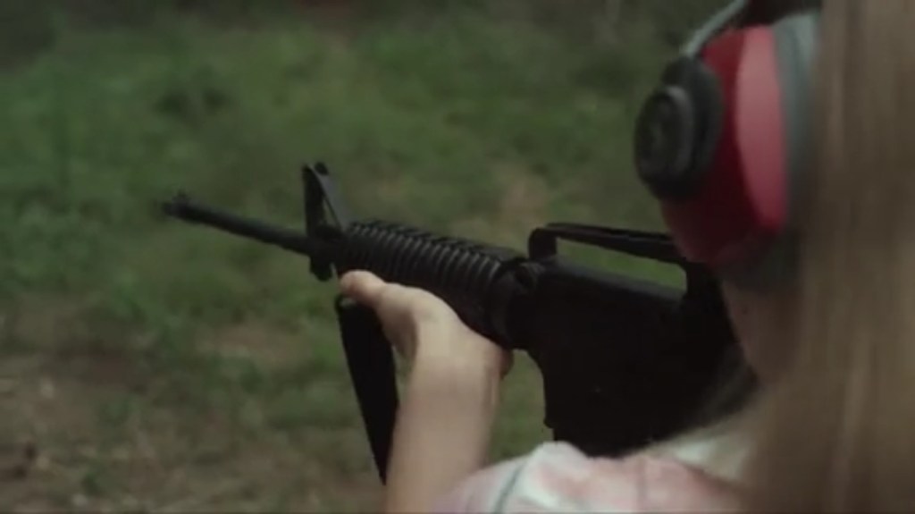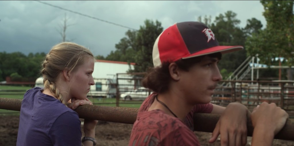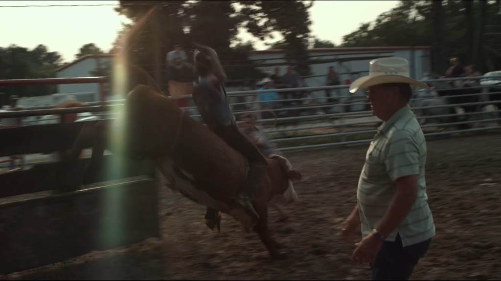 La communauté ce sont ces fermiers -chez nous on dirait des paysans -des états ruraux du sud-ouest des Etats-Unis. En dehors de leurs élevages, ils ont deux passions : le rodéo et les armes à feu. Pour le rodéo, il faut s’entraîner dur. Et depuis le plus jeune âge. Sur un taureau en métal, que l’on secoue par derrière énergiquement. Et puis sur des bêtes de plus en plus puissantes, jusqu’au jour on l’on pourra affronter le public, une foule toujours passionnée. Tout cela provoque bien des chutes et les accidents ne sont pas rares, malgré l’équipement de protection.