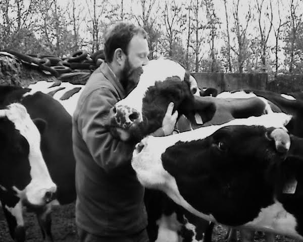 Creton filme aussi Jean-François, son supérieur puisque c’est lui qui l’a recruté, mais pas vraiment son chef. Il va lui aussi de ferme en ferme, discutant des problèmes des exploitations. Il montre une photo où il avait 5 ou 6 ans, entre sa mère assise près d’une vache et son grand frère. Toute une vie passée à la campagne en relations avec les vaches et les problèmes de lait, ce qui ne l’empêche pas de lire Kierkegaard. Le soir il va boire une bière dans le pub anglais du coin. Et il pose torse nu pour une amie artiste qui sculpte son buste en argile. Le film se terminera d’ailleurs juste après le vernissage de l’exposition qui lui est consacrée. Autour de la sculpture sont exposées des fragments de plans dessinés à la craie sur des ardoises et des photos de vaches et de lui-même. Il a son moment de célébrité.