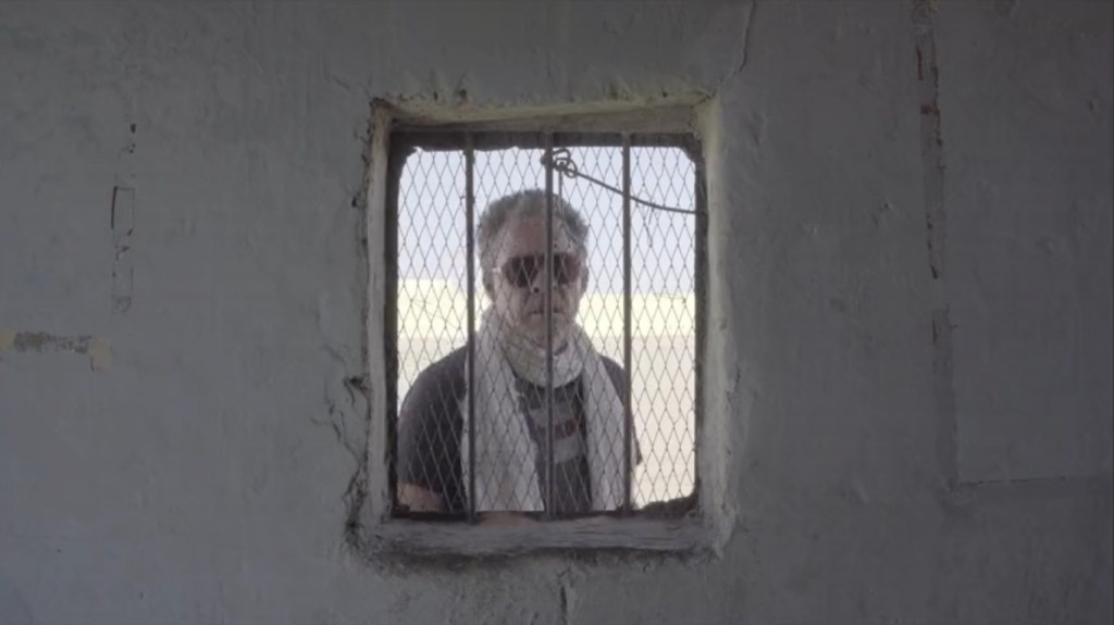 Le film est presque entièrement tourné à l’intérieur de la buvette de Malika. Des plans fixes sur cette vieille femme à la carrure imposante, assise le plus souvent à une table -la seule de la pièce – où se joignent à elle ceux qui font halte ici. Le désert ; on n’en voit qu’un petit fragment, par la fenêtre ou la porte de la buvette. Parfois, pour nous en montrer un tout petit peu plus, la caméra est placée devant la buvette. Mais cela revient au même. On ne quitte pas cet espace en principe infini mais dans lequel nous sommes enfermé comme dans une prison. D’ailleurs, une scène extraordinaire nous montre un des habitués de la buvette jouer au prisonnier derrière le grillage de la fenêtre.