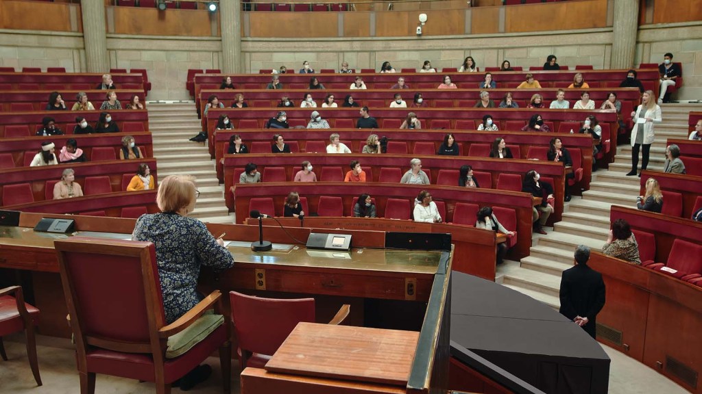 Le premier est une aventure parlementaire, ou du moins une aventure vécue par deux députés, de bords différents, voire opposés, l’insoumis François Ruffin et le marcheur, Bruno Bonnell. Un duo désaccordé au départ à qui est confié une mission concernant donc les métiers du lien. Des auditions à l’assemblée ou au siège des associations, au vote dans l’hémicycle – ou plutôt au rejet par les députés des amendements proposés par Ruffin – en passant par la rédaction du rapport, nous suivons l’activité de ces deux députés qui finissent par s’entendre sur l’essentiel, malgré leurs différences d’appartenance politique, de style et de vocabulaire. Le film propose ainsi une connaissance, ou du moins une illustration, de l’exercice du pouvoir législatif. Un des deux protagonistes étant co-auteur du film, il apparaît bien vite que le film ne peut pencher que de son côté. Le travail parlementaire n’est pas vraiment glorifié. Est-il d’ailleurs bien utile puisque les propositions de Ruffin ne font pas long feu. Il y a dans tout ça une sorte de défiance, ce vers quoi tend d’ailleurs la fiction finale d’une assemblée entièrement féminine et s’exprimant sur les problèmes que ces femmes ont évoqués tout au long du film. « Debout les femmes » chantent-elles toutes en levant le poing, ce qui est d’ailleurs le seul moment qui peut justifier le titre du film, un film qui jusqu’à ce final n’est pas vraiment un appel à la révolte ou à la révolution.