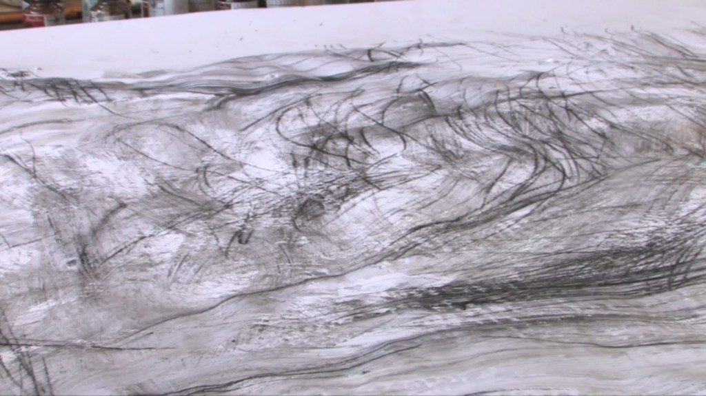 Le film de Céline Dréan n’est pas, malgré son titre, un film sur le travail de nuit et ses conditions. Séra est auteur de bande dessinée., connu et reconnu. Une bonne partie du film le montre crayon ou pinceau à la main. Et pas seulement dans son hôtel la nuit. Dans son atelier parisien, on le voit réaliser de grandes compositions colorées. Un travail d’artiste qui déborde largement la publication d’albums de BD. Pourtant, ceux de Séra ont du succès malgré, ou plutôt grâce à son opposition à la mode dominante à ses débuts de la Ligne Claire, en provenance directe de l’école Belge dominée alors par Hergé. Et effectivement, les planches que la cinéaste filme plein cadre n’ont pas grand-chose à voit avec Tintin.