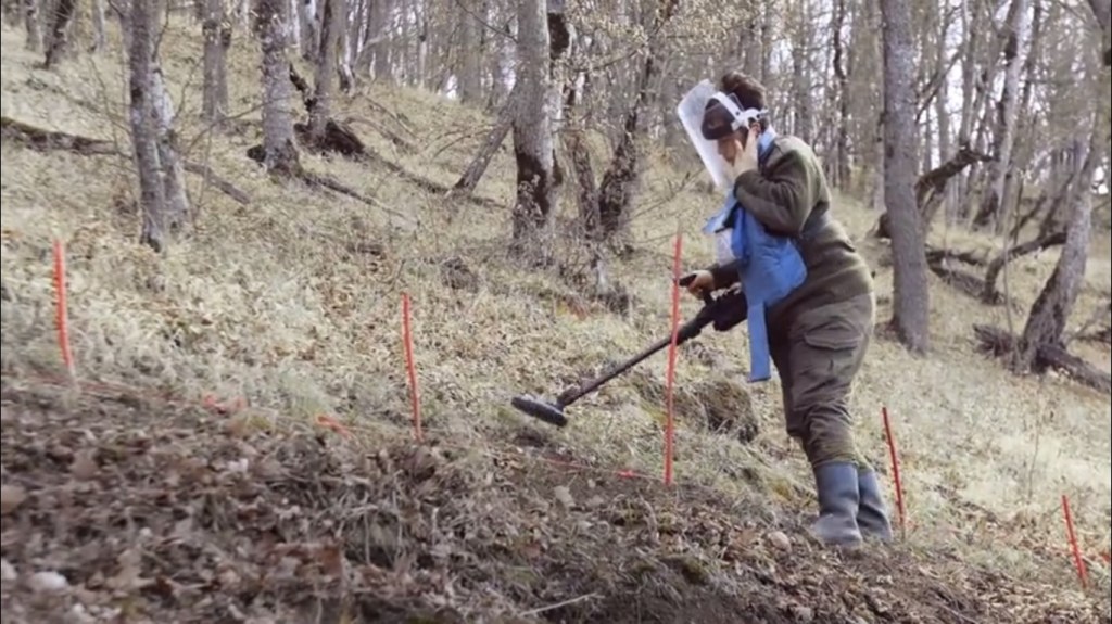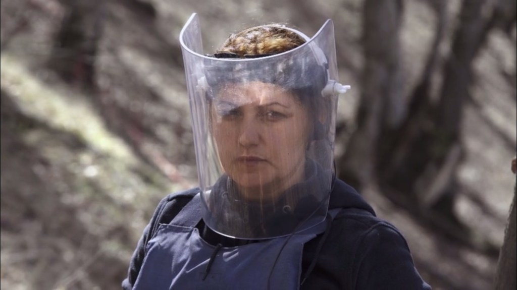 Nous suivons dans leur travail quotidien une équipe de déminage composée de cinq femmes et deux hommes, faisant partie d’une organisation anglo-américaine, The Halo trust. Un travail long, minutieux, dangereux, même si nous ne voyons pas vraiment le danger à l’image. Et c’est là tout le paradoxe du film – et sa force ! Dans un paysage qu’un regard touristique pourrait trouver grandiose, c’est une partie de cache-cache avec la mort qui se joue dans un calme impressionnant. Un calme qui reflète la patience, la détermination, la concentration qui s’inscrit sur ces visages de femmes qui côtoient un danger mortel. Mais la cinéaste ne montre pas directement les mines. Il n’y a que deux explosions (parfaitement maîtrisées) durant les quelques jours que dure le film.