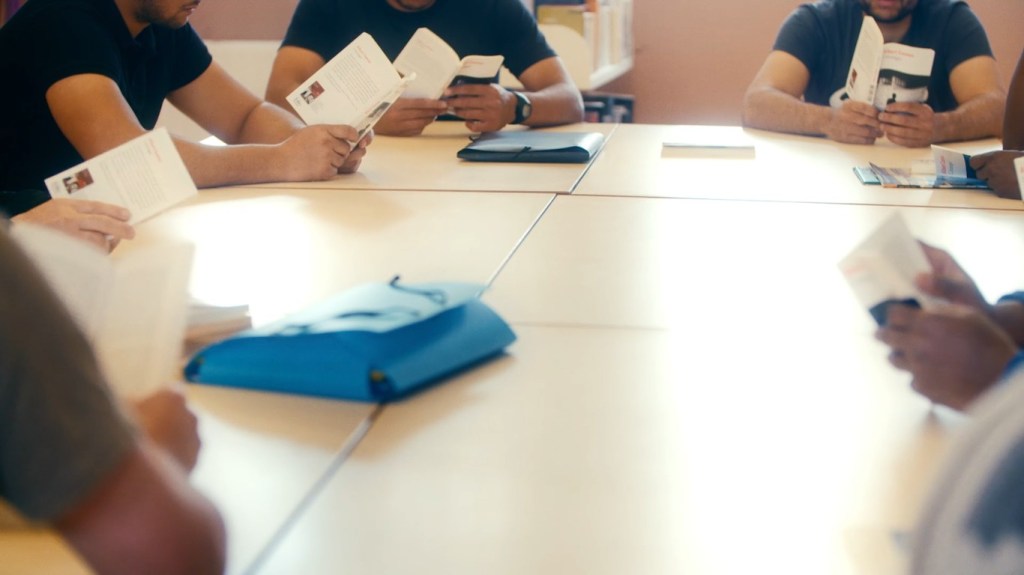 Mais surtout, nous assistons à des « cercles de lecture » où en petits groupes, ace l’aide d’un animateur, s’opère une mise en commun, un partage, des expériences de lecture. Chacun peut évoquer le ou les livres qu’il a lus dans la semaine. Un intervenant – un philosophe par exemple – présente avec précision le sens de son travail. Mais le plus émouvant, ce sont ces séances de lecture à haute voix, quelques pages à tour de rôle. La lecture est parfois hésitante, mal assurée, mais ici on ne recherche pas la performance d’acteur. L’important c’est l’effort nécessaire pour prendre la parole devant le groupe. La lecture de l’Etranger de Camus est ici particulièrement chargée de sens pour chacun.