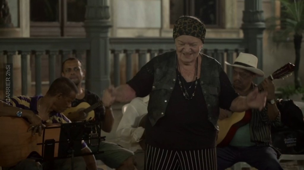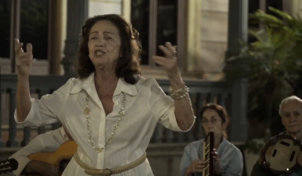 Ces moments de partages sont bien sûr placés sous le signe d’une intense nostalgie. Ce qui correspond parfaitement à cette musique brésilienne où domine la référence à la samba. Mais ici, nous ne sommes pas au carnaval. Le rythme est plutôt lent, presque langoureux parfois. Mais il appelle toujours la danse, le mouvement du corps, mais sans déhanchement, avec cette retenue placide qui n’a rien à voir avec l’âge. Si certaines ont du mal à marcher, dès qu’elles chantent on sent bien qu’elles oublient le poids des ans et les douleurs qui vont avec. De toute façon, les voix sont intactes. L’émotion est toujours là, submergeant tout autant les spectateurs du film que les présents dans le parc.