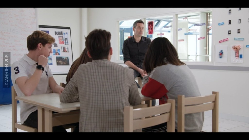 Cette éducation – qui est d’ailleurs plus précisément une formation personnelle – peut-elle s’adresser à tous les élèves, à partir d’un certain âge, celui de l’adolescence ? Certes dans le film, on a affaire à un petit groupe de filles et de garçons volontaires, mais qui ont certainement été choisi.e.s de façon a pouvoir assurer la possibilité même du film. Mais il n’en reste pas moins nécessaire (en mettant entre parenthèse ce qui concerne le film) que les élèves doivent pouvoir s’écouter les uns les autres, sans couper la parole, sans invectiver, et surtout pas insulter, ceux avec qui ils ne sont pas d’accord. Ils doivent pouvoir argumenter rigoureusement et bien sûr il s’agit là d’une compétence transversale qui se retrouve dans toutes les disciplines scolaires. Enfin ils doivent pouvoir s’exprimer librement, sans fausse pudeur et sans fausse honte, donc sincèrement, même si bien sur il n’est jamais évident de révéler un peu de son intimité secrète devant les autres. Mais c’est justement le rôle de l’animateur de crée le climat, l’ambiance, qui permettra que tout se passe dans la bonne humeur mais aussi avec le sérieux indispensable au monde scolaire.