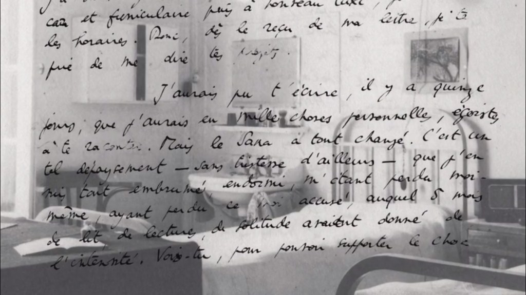 Pas plus que les lettres de Roland Barthes, le film de Frédéric Goldbronn n’évoque cette guerre, en dehors de la rapide mention que fait une lettre de la Libération de Paris. Le film se consacre sur le sanatorium. Celui-ci est aujourd’hui abandonné, voué à la destruction, d’où les plans sur les pans de murs qui s’écroulent, de longs travellings aussi dans des couloirs qui sembles interminables, des espaces déserts où la pluie qui s’infiltre partout n’arrive pas à combler le vide qui se dégage irrésistiblement d’un filmage utilisant systématiquement des surcadrages à partir de portes et de fenêtres.