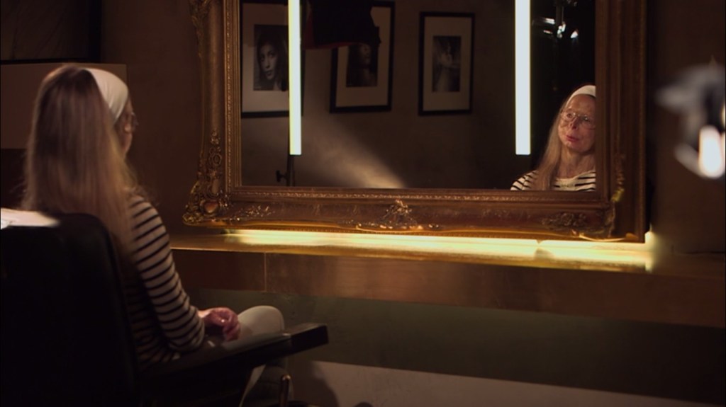 Le film de Didier Cros nous permet de rencontrer quelques-uns de ces abimés de la vie et dont la présence devant la caméra fait incontestablement partie de leur travail d’acceptation et de reconstruction. Un travail sur leur propre image – sur l image de la différence- d’autant plus que le dispositif mis en place par le cinéaste les place devant un grand miroir, dans une salle de maquillage d’un grand studio de photographie. Des professionnels de l’image vont réaliser leur portrait, dans le style bien connu du célèbre studio (le studio Harcourt, connu pour ses portraits de stars), un visage soigneusement éclairé, en noir et blanc, dans une pose très stylisée. Filmé.e.s avec une grande délicatesse, ces hommes et ces femmes vont se confier par petites touches, mais avec une grande franchise, devant ce miroir qui les surcadre et avant de se mettre entre les mains des photographes qui font tout pour les mettre à l’aise.
