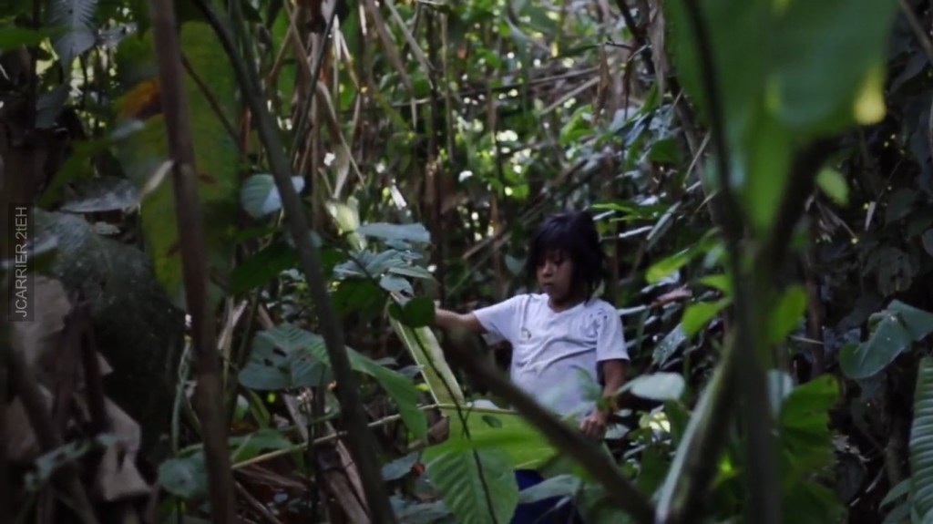 Un groupe d’enfants dans la forêt amazonienne, à la frontière entre l’Equateur et le Pérou. Des enfants que nous suivons au jour le jour, dans leur vie de tous les jours, dans leurs activités quotidiennes. Ils marchent dans la forêt, se taillant un chemin à coup de machette. Ils grimpent aux arbres, haut. Ils cueillent des fruits. Ils ont leurs jeux, des toupies faites avec un fruit rond. Ils fabriquent des colliers avec des graines. Ils improvisent des balançoires avec un tronc d’arbre. La forêt est leur domaine. Ils la connaissaient parfaitement. Chaque animal, chaque, insecte, les araignées, les serpents, et dans le fleuve, les poissons.
