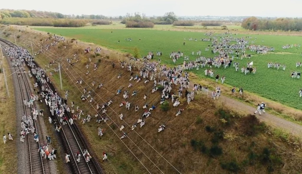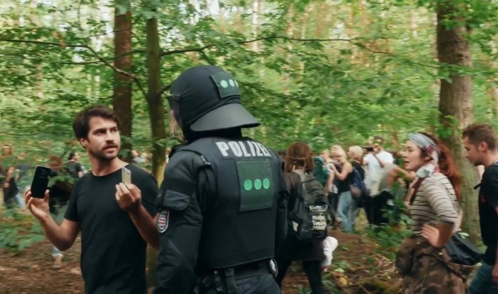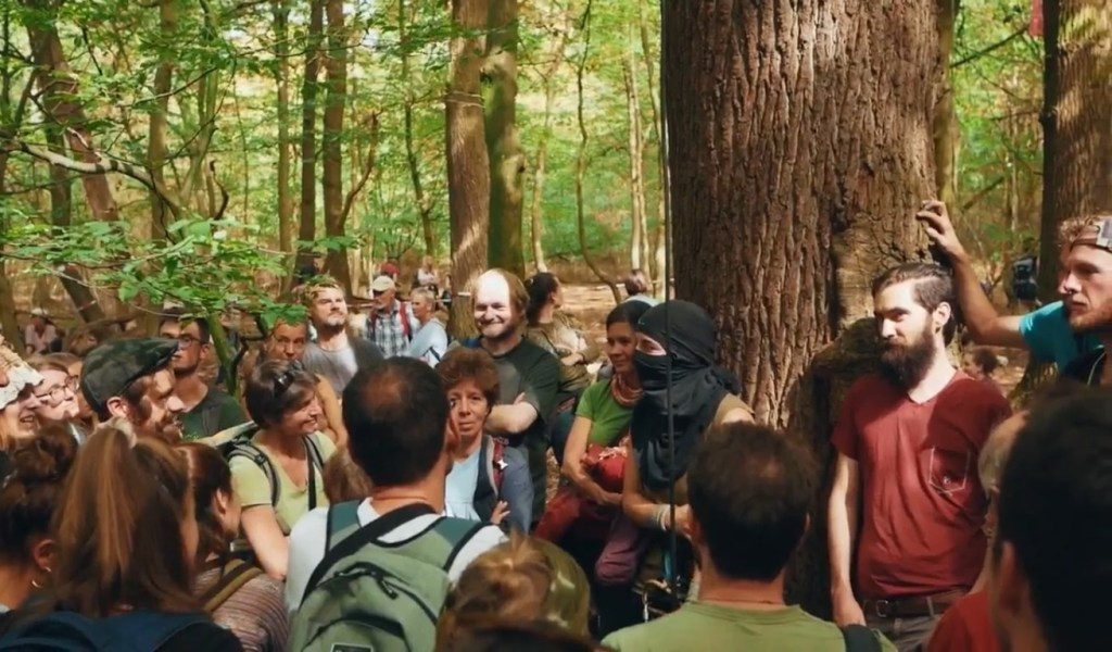 Le film s’attarde longuement sur cet affrontement direct au milieu de la forêt et qui met face à face des moyens totalement disproportionnés, ce qui est bien sûr le cas au niveau de la bataille juridique qui s’est aussi engagée. Le spectateur ne peut donc que prendre position pour le camp du plus faible, dont l’action pour la défense de l’environnement se voit ainsi grandement valorisée. Nous ne sommes pas dans une manifestation traditionnelle, même si une mobilisation de soutien de grande ampleur se développe vers la fin du film. Elle est certes filmée au drone de façon spectaculaire (le grandes files de manifestants dans la campagne sont impressionnantes), mais c’est le quasi corps à corps des activistes avec la force pure et aveugle des machines de destructions qui peut le plus émouvoir le spectateur et même le révolter.