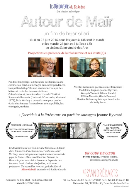 Le film de Hejer Charf est un film de rencontres. Comme son titre le laisse entendre, c’est tout le contexte culturel de l’engagement féministe, « autour » de Maïr, que nous découvrons. Les figures de la littérature, de Madeleine Gagnon à Hélène Monette, et tout ce qui a compté dans le monde littéraire québécois de la fin du XX° siècle. Des noms qui résonnent haut et fort, Monique Bosco, Jeanne Hyvrad, Nelly Arcan, Hélène Parmelin, pour ne citer que les plus connus. Si sa référence « incontournable », c’est bien sûr Simone de Beauvoir – que Maïr est loin d’idolâtrer tout en reconnaissant son importance, il faut aussi mentionne Benoite Groult, dont l’influence outre atlantique est tout aussi importante.