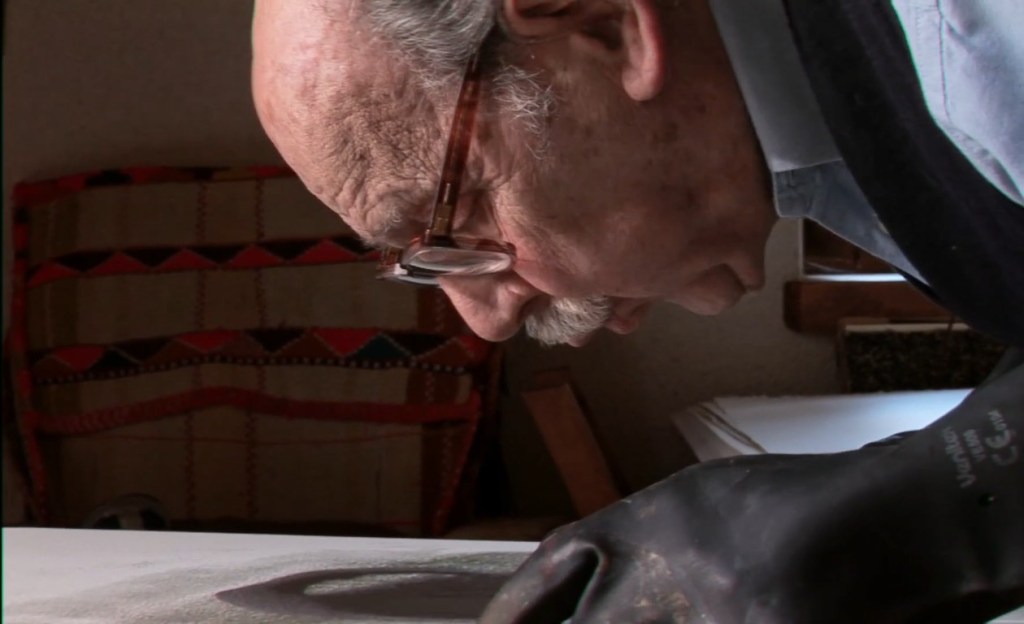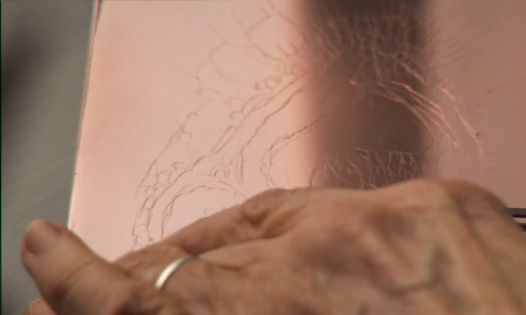 Pourtant le film est surtout consacré à Cécile, sa jeunesse, sa traversée de la guerre et de l’occupation nazie, elle la petite fille exilée depuis la Lituanie. La lecture d’un très beau texte évoquant son retour, possible-impossible, à Vilnius, nous plonge dans ce vécu tourmenté et la béance qu’il a laissée en elle. Elle évoque aussi la façon dont elle en viendra à assumer sa judaïté, alors que son père était bien loin de la religion. Depuis la disparition de son compagnon, elle ne grave plus, comme si la source de son inspiration s’était tarie. Mais dans les images du passé que nous présente Chatellier nous la retrouvons burin à la main face à la plaque de cuivre. Une séquence montrera également vers la fin du film, la préparation de la plaque pour la réalisation d’un tirage. L’œuvre de Cécile, comme celle de Fred, n’est-elle pas éternelle ?