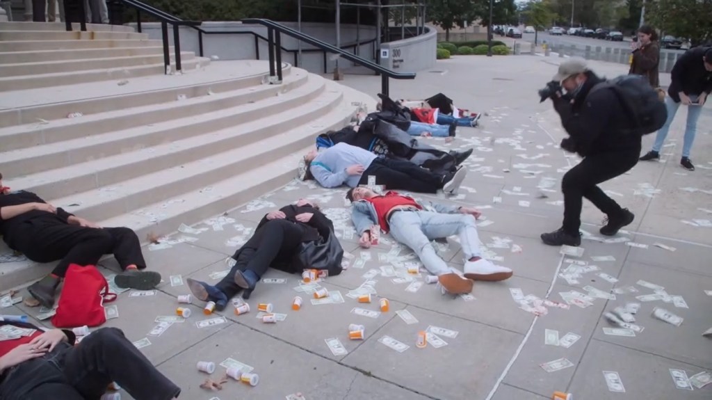D’un autre côté, Nan a un compte à régler avec la famille Sackler, qui a fait fortune grâce à l’OxyContin et qui est devenu, façon de se donner bonne conscience, un mécène important des grands musées new-yorkais, du MET au Guggenheim, et jusqu’à Londres. C’est donc dans les musées que Nan et le groupe d’activistes qu’elle a fondé (dénommé PAIN) va intervenir, de façon tout autant artistique que politique.