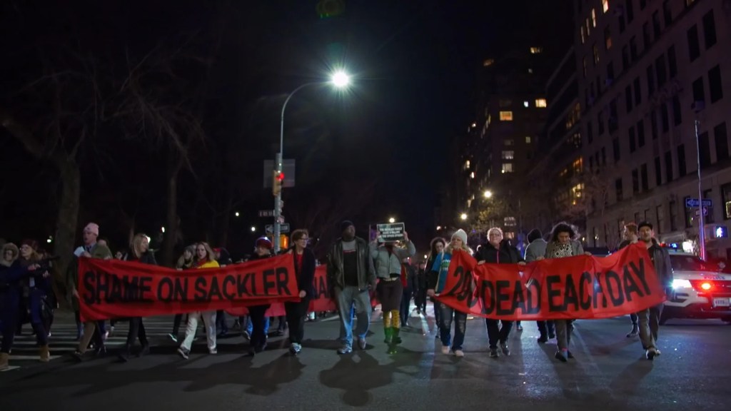 Nous assistons aux préparations et à l’exécution d’actions spectaculaires dans les musées. Il s’agit d’exiger d’eux qu’ils retirent le nom de Sackler de leur communication et même de refuser les nouveaux dons de la famille. Des exigences qui vont peu à peu finir par être acceptées. Des victoires réjouissantes pour toutes les victimes de l’OxyContin.