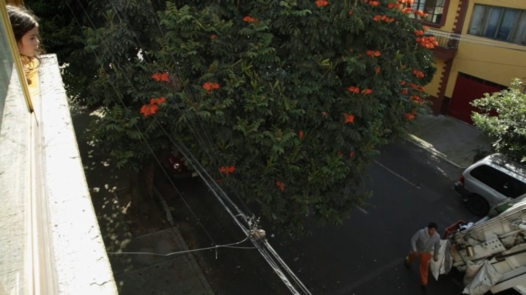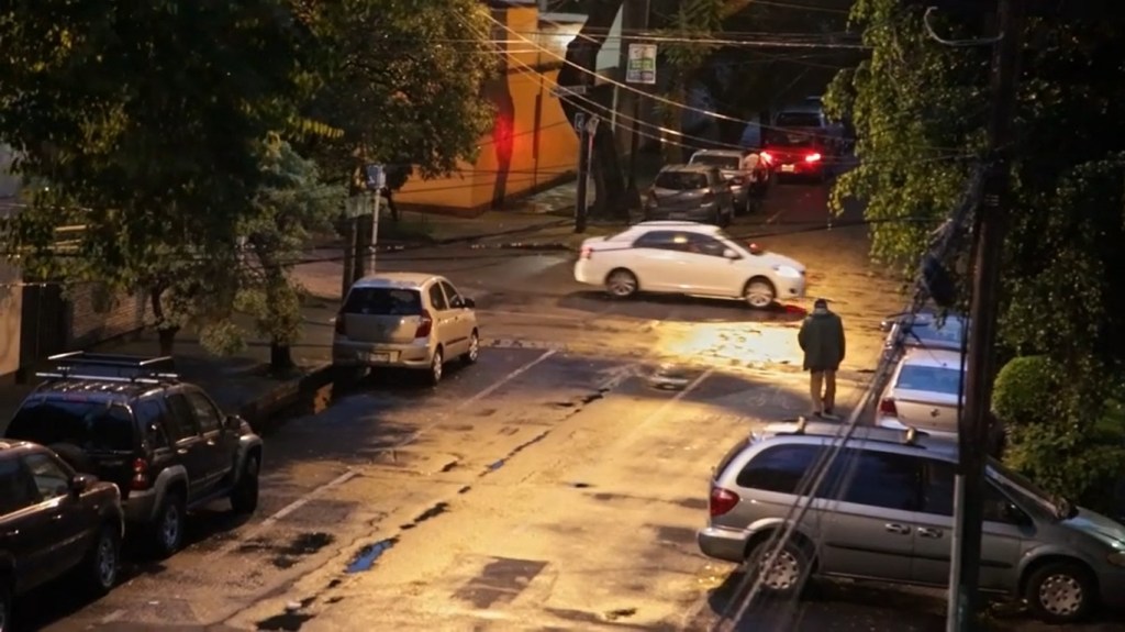 La rue Malentzin est une rue calme, située dans un quartier plutôt résidentiel. Il y a ceux qui travaillent (les éboueurs et les balayeurs de rue), et ceux qui ne travaillent pas (qui promènent leur chien) ; il y a les mamans qui accompagnent leur enfant à l’école, et d’autres enfants qui doivent en revenir ; il y a des automobiles, beaucoup, qui se garent ou qui démarrent et même une qui est en panne. Et comme nous sommes en Amérique centrale, il y a tous ces petits vendeurs de rue qui proposent à la criée des beignets ou autres pâtisseries, mais aussi du gaz, du fer ou des journaux usagés. La caméra capte tout cela sans effet particulier, sauf lorsqu’elle zoom le soir sur un couple qui s’embrasse, ce qui révèle son petit côté voyeur.