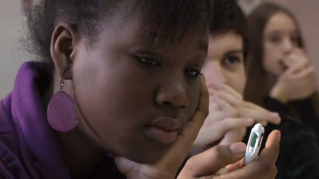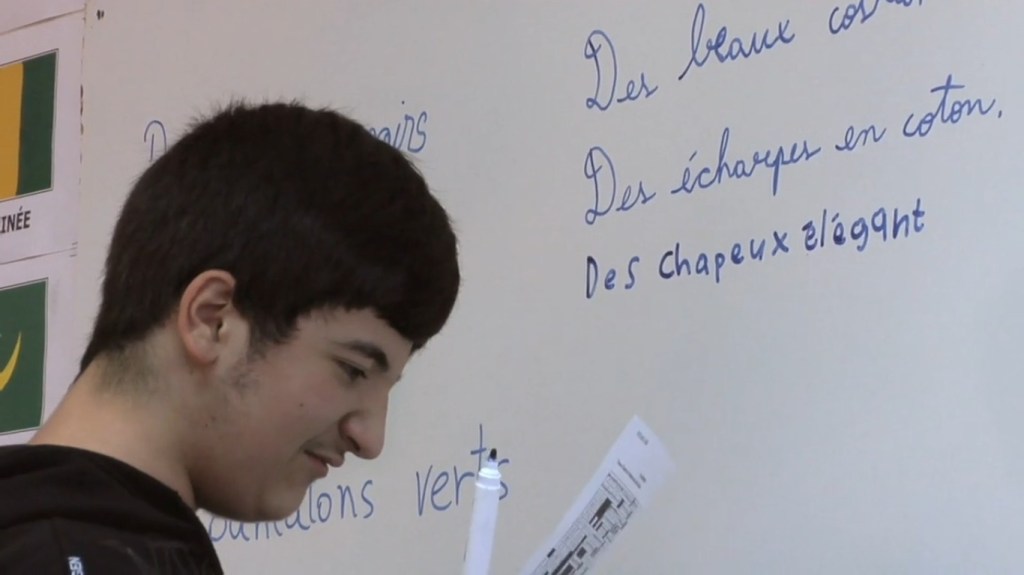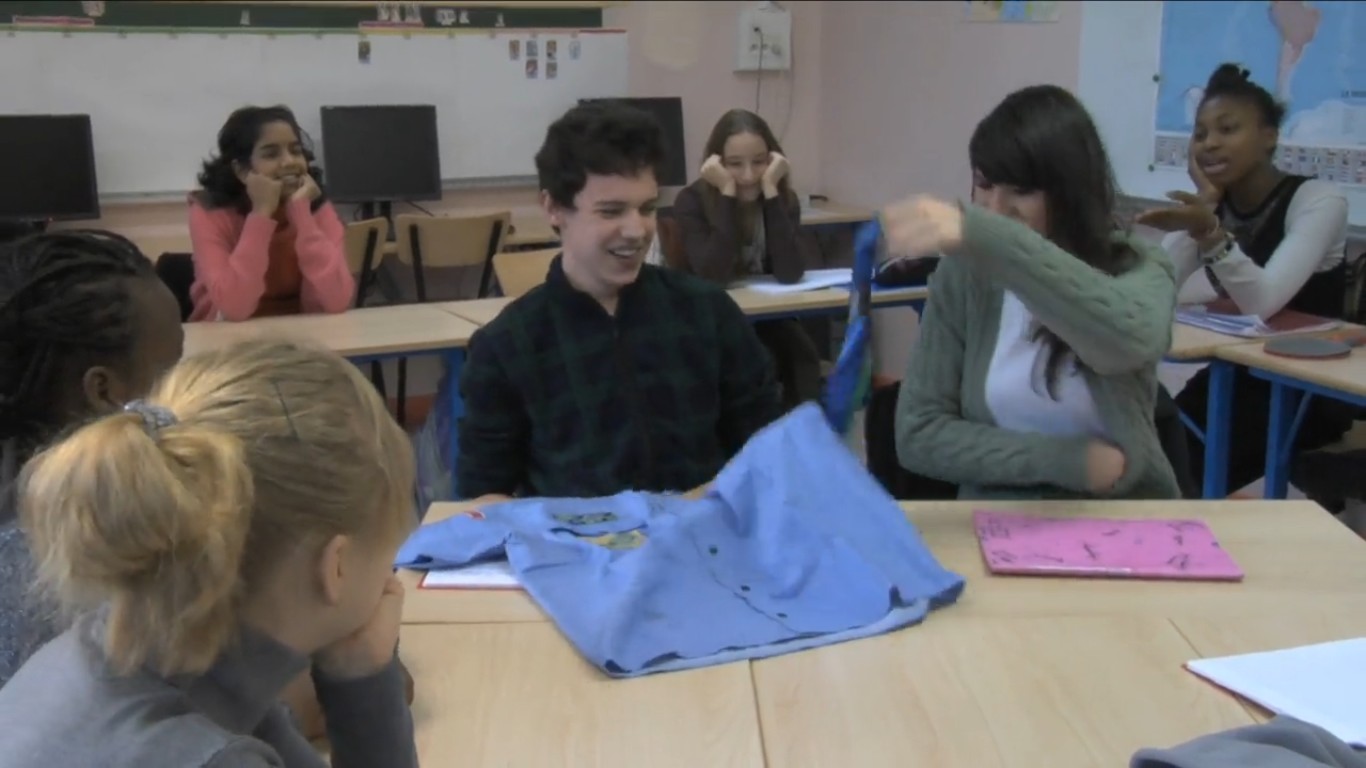 Nous suivons donc quelques-unes des activités pédagogiques qui vont permettre à ces jeunes si différents de progresser dans la langue de Molière. Ils se présentent, évoquent leur arrivée en France, comment ils ont vécu le départ de leur pays où, pour la majorité, ils ne reviendront jamais. La professeure de français qui les guide tant au niveau de la correction des phrases que de la prononciation, est omniprésente, mais le film la laisse souvent hors cadre, privilégiant les gros plans sur les visages des élèves ou les vues plus larges sur leur groupe. Les situations de communication proposées doivent aussi permettre de souder le groupe. Les élèves apprennent à se connaître et surtout à s’accepter les uns les autres dans leurs différences. S’il est important qu’ils gardent leur langue d’origine, il en est de même pour leur culture, et leur religion, surtout si cette dernière tient une place importante dans leur vie. Cet aspect relationnel est aussi au centre du travail vidéo qui est entrepris. Les élèves réalisent un film qui sera présenté, et primé, à Chartres au festival des films scolaires. Un grand moment de bonheur pour les élèves. La réalisation de leur œuvre vidéo tient pourtant une place minime dans le film de Bertuccelli. Visiblement, elle a choisi de privilégier le travail d’accompagnement réalisé par l’enseignante de français, ses réceptions des parents et les entretiens individualisés avec les élèves, soit pour commenter avec eux leurs résultats scolaires et envisager la suite de leurs études, soit pour évoquer les différents problèmes qui surgissent dans la classe. Le cas de la jeune africaine qui se vit en opposition avec l’ensemble de ses camarades est ainsi abordé à plusieurs reprises. De façon indispensable par rapport à d’autres contextes scolaires, l’enseignant est ici, peut-être avant tout, un éducateur.