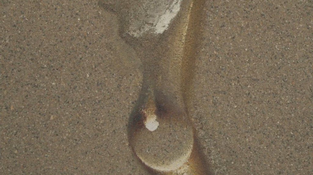 Le film nous montre le peintre au travail. Avec un mince pinceau, une petite retouche de ci de là. Il nous montre aussi des expositions de l’œuvre, des spectateurs qui passent devant les toiles, sans exprimer une quelconque réaction. Il nous montre aussi l’œuvre. Dans une séquence remarquable, les tableaux plein cadre défilent et la voix off du fils -une voix présente tout au long du film- désigne d’un mot, d’une expression, d’un adjectif, ce que sont ces gouttes d’eau. L’affirmation de la diversité, de la richesse. L’univers entier dans une goutte. Et tout l’art aussi. Paradoxe absolu par rapport à l’absence de signification affirmée par ailleurs.