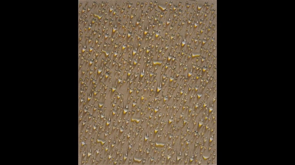 Pourquoi peindre des gouttes d’eau ? Pourquoi ne peindre que des gouttes d’eau. De grands tableaux, avec des fonds neutres, et les gouttes, tout simplement. D’où vient cette manie, cet acharnement, cette passion ? La recherche de la perfection peut-être. Alors, pourquoi pas les goutes d’eau.