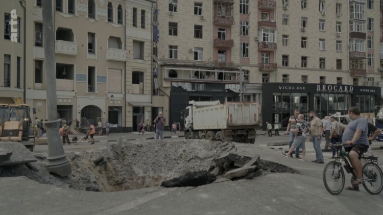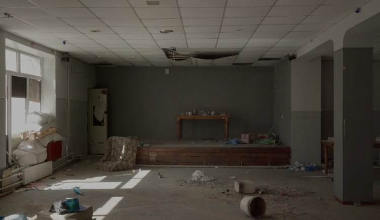 Interceptés propose un dispositif particulièrement original. Vraiment surprenant, déroutant même. La bande son propose des extraits d’appels téléphoniques de soldats russes engagés sur le front ukrainien – ils ne peuvent cependant pas dire où exactement. Alors que les images (accompagnés quand même de bruits de fond en sourdine) totalement décalées par rapport aux conversations téléphoniques, nous promènent dans ce pays en guerre, envahi par une armée étrangère, à travers les ruines et les destructions, filmées en plans fixes en ville ou en longs travellings latéraux dans la campagne.