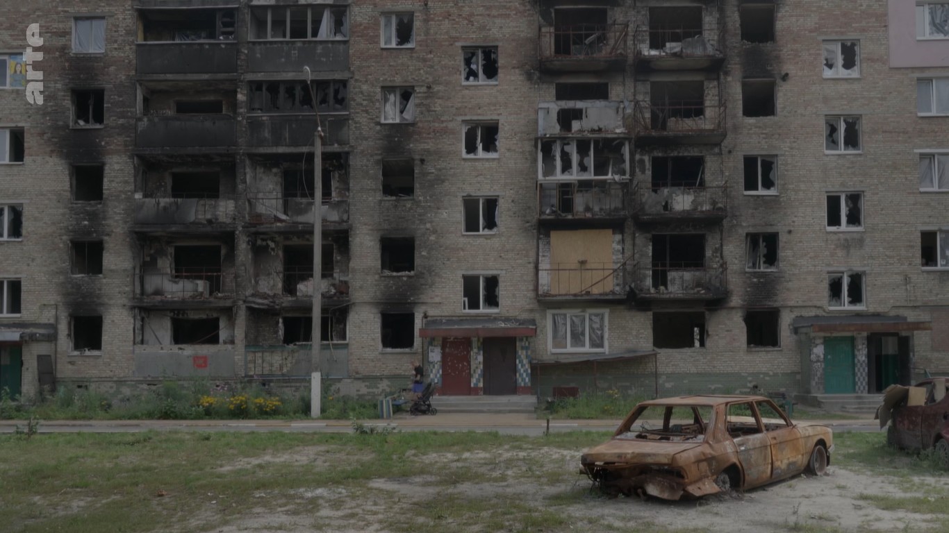 Des immeubles portant les traces de l’incendie provoqué par les bombes, des maisons de campagne au toit éventré, des intérieurs d’habitation (cuisines ou salons…) réduits à un chaos absolu, des images de guerre, ou plutôt des conséquences de la guerre, comme on en a vu hélas beaucoup. Sauf qu’ici, on ne voit pas vraiment la guerre, on ne voit pas les combattants, les armes, le feu, les chars (ou alors réduits à l’état de carcasses rouillées), ou les bombes larguées par des avions. Ici la guerre est invisible. Mais elle n’est pas finie pour autant. Et ses traces sont omniprésentes.