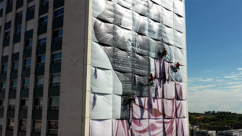 Dans le premier film, la tour avait toujours été filmée d’en bas, en contre-plongée le plus souvent, pour montrer son aspect imposant, écrasant. Pour ce second film j’ai choisi de réaliser des images à partir de drones qui tournent autour d’elle, l’encerclent, pour lui donner un aspect plus fragile, de même la grande toile blanche tel un linceul à tous les vents accentuait cet aspect éphémère de l’avenir de la tour.